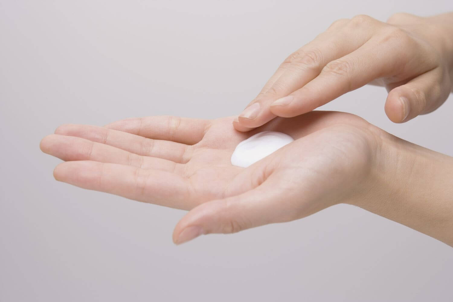 Απλώνουμε 4-5 δόσεις κρέμας στις παλάμες (περίπου 1 κουταλάκι του γλυκού) και προετοιμάζουμε την εφαρμογή.